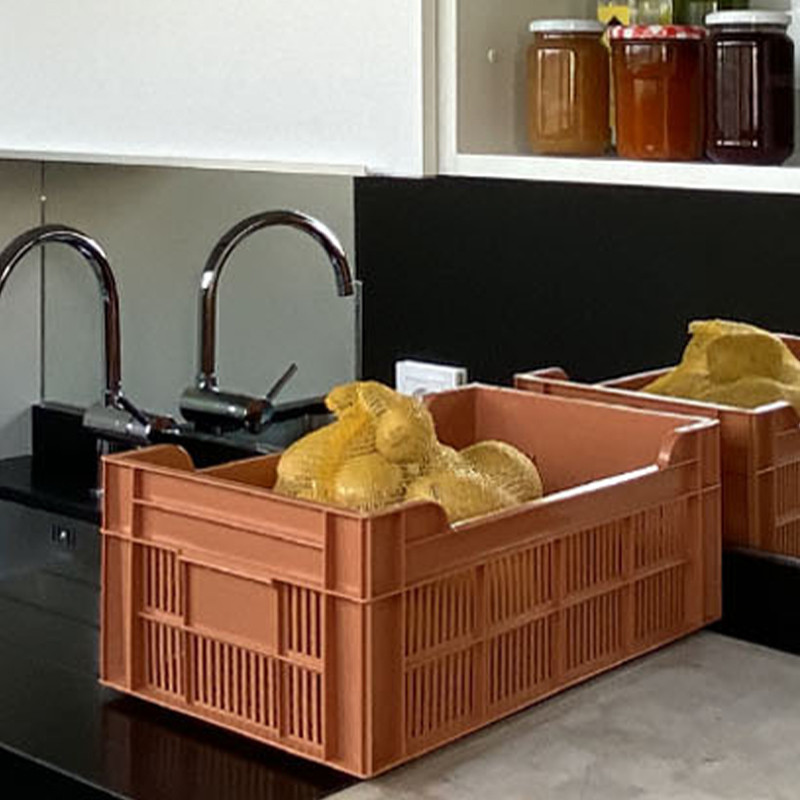 Ces caisses trouveront leur place dans un cellier pour stocker des fruits, des légumes, des pommes de terre... Avec leur coloris tendance, pas besoin de les cacher, elles peuvent être posées sur le plan de travail ou empilées au sol. Les caisses 20 L reprennent les standards des caisses utilisées par les professionnels : poignées intégrées pour faciliter la prise en main, parois ajourées pour assurer l’aération de la caisse et elles sont facilement empilables sur une grande hauteur ! Vous pouvez également les détourner de leur usage principal pour en faire des caisses de rangement dans une chambre d’enfant ; elles sont parfaites pour ranger des peluches avec leur couleur douce.
